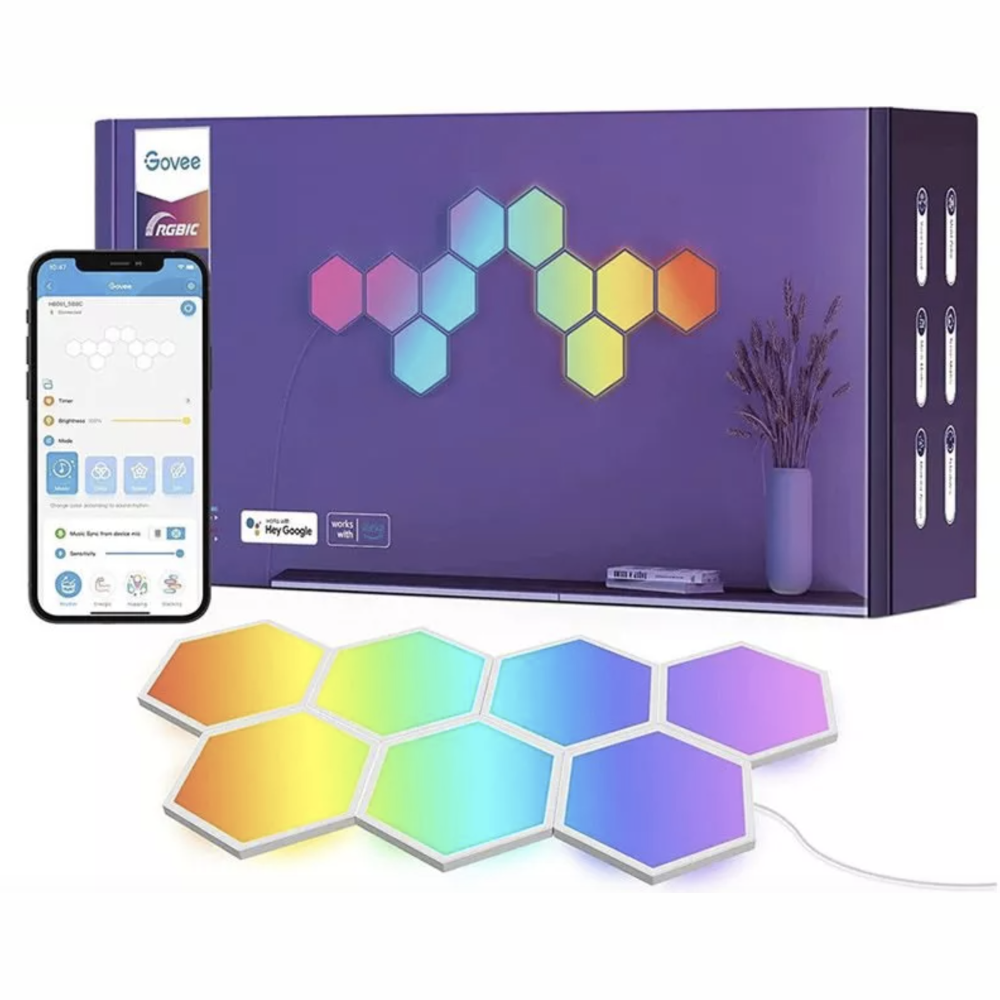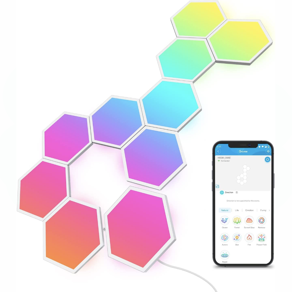 تتكون لوحات الإضاءة السداسية Govee Glide من 7/10 ألواح قابلة للتشكيل بأشكال متنوعة. يمكنك التحكم بها باستخدام مساعديك الصوتيين المفضلين، مثل Alexa وGoogle Assistant، بالإضافة إلى تطبيق Govee Home. كما يمكنك تخصيص تصميمك وتأثيراتك وألوانك والمزيد.