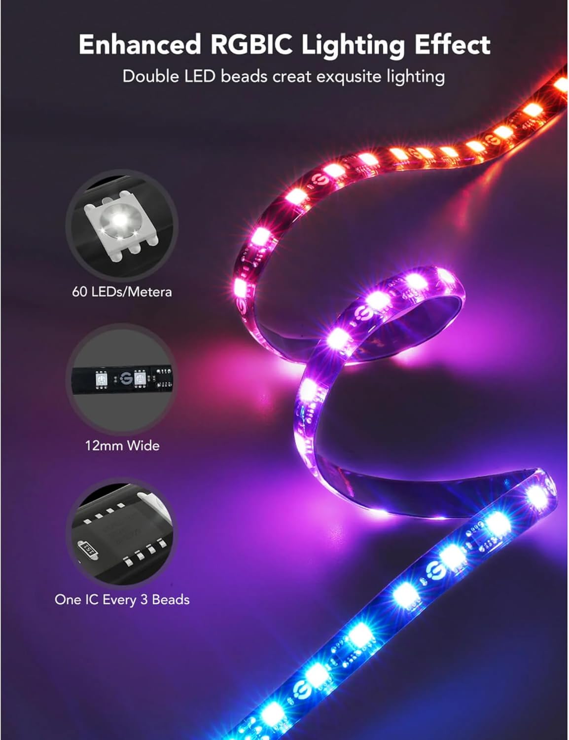 - إضاءة RGBIC محسنة: مع 60 مصباح LED/م مطور وحبات ضوء مضاعفة، استمتع بتوزيع حبات ضوء RGBIC الأكثر كثافة للحصول على إضاءة أكثر حيوية وطبيعية، مما يساعد على تعزيز مشاهدة الأفلام والألعاب الغامرة.