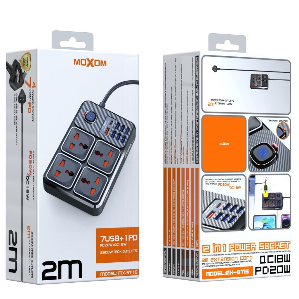وصلة موكسوم MX-ST15 بقدرة 2500 وات بحد أقصى 4 منافذ طاقة 7 منافذ USB ومنفذ PD من النوع C بقدرة 20 وات ومنفذ QC بقدرة 18 وات ومقبس المملكة المتحدة وشحن سريع وآمن لمدة 2 متر ST15