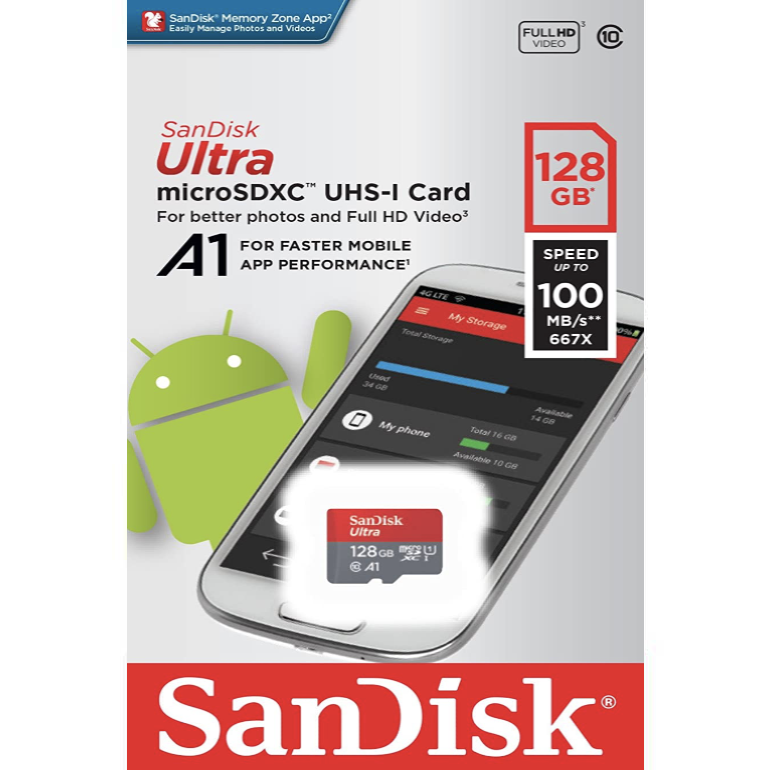 بطاقة ذاكرة سانديسك ألترا مايكرو إس دي إكس سي يو إتش إس-1 بسعة 128 جيجابايت - 100 ميجابايت/ثانية، C10، U1، عالية الدقة، A1، مايكرو إس دي - SDSQUA4-512G