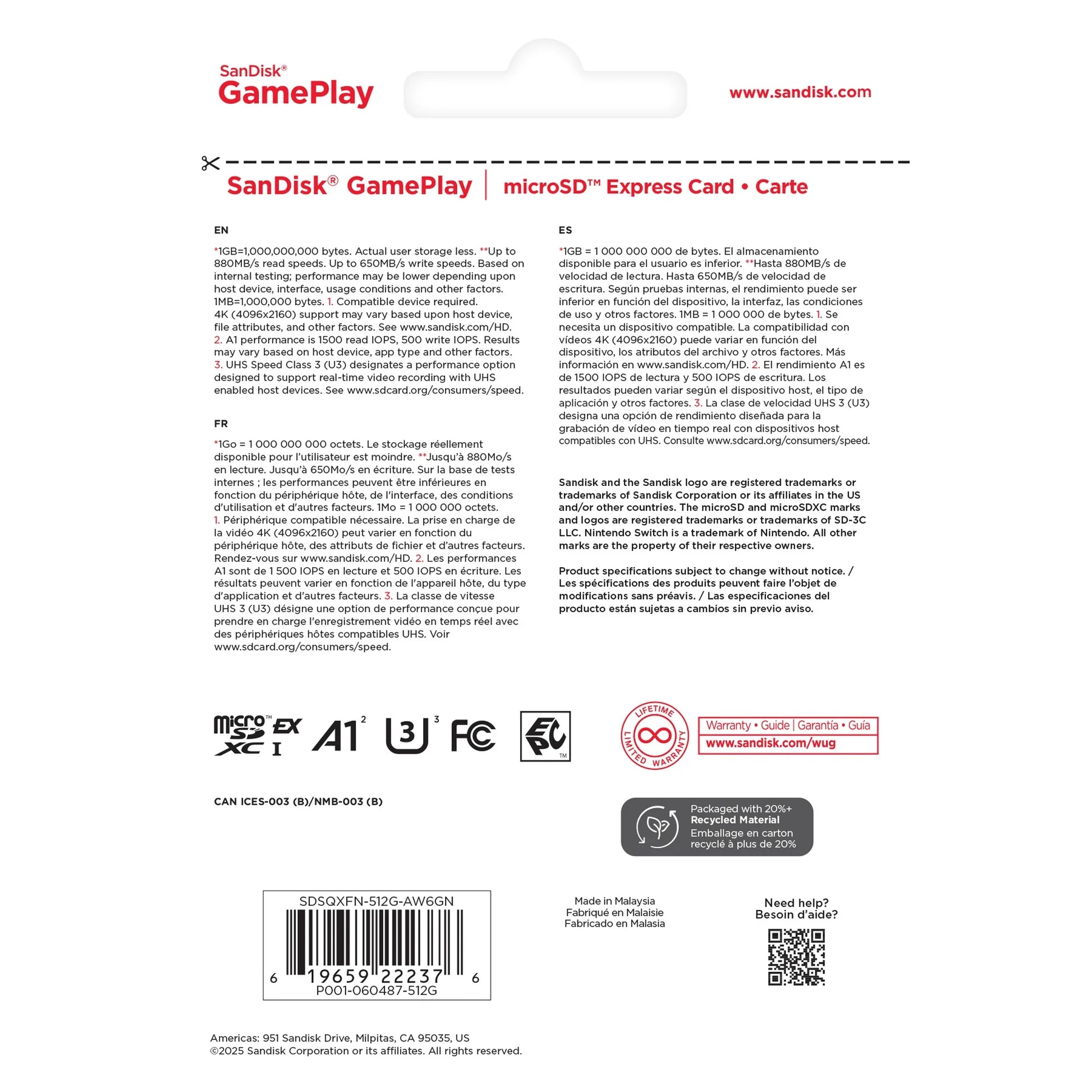 - [512GB] 512GB1 microSD™ Express cards deliver up to 880MB/s2 read speeds, up to 650MB/s2 write speeds, and 220MB/s2 sustained write speeds, when used with SanDisk® PRO-READER SD Express Dual Card (sold separately).