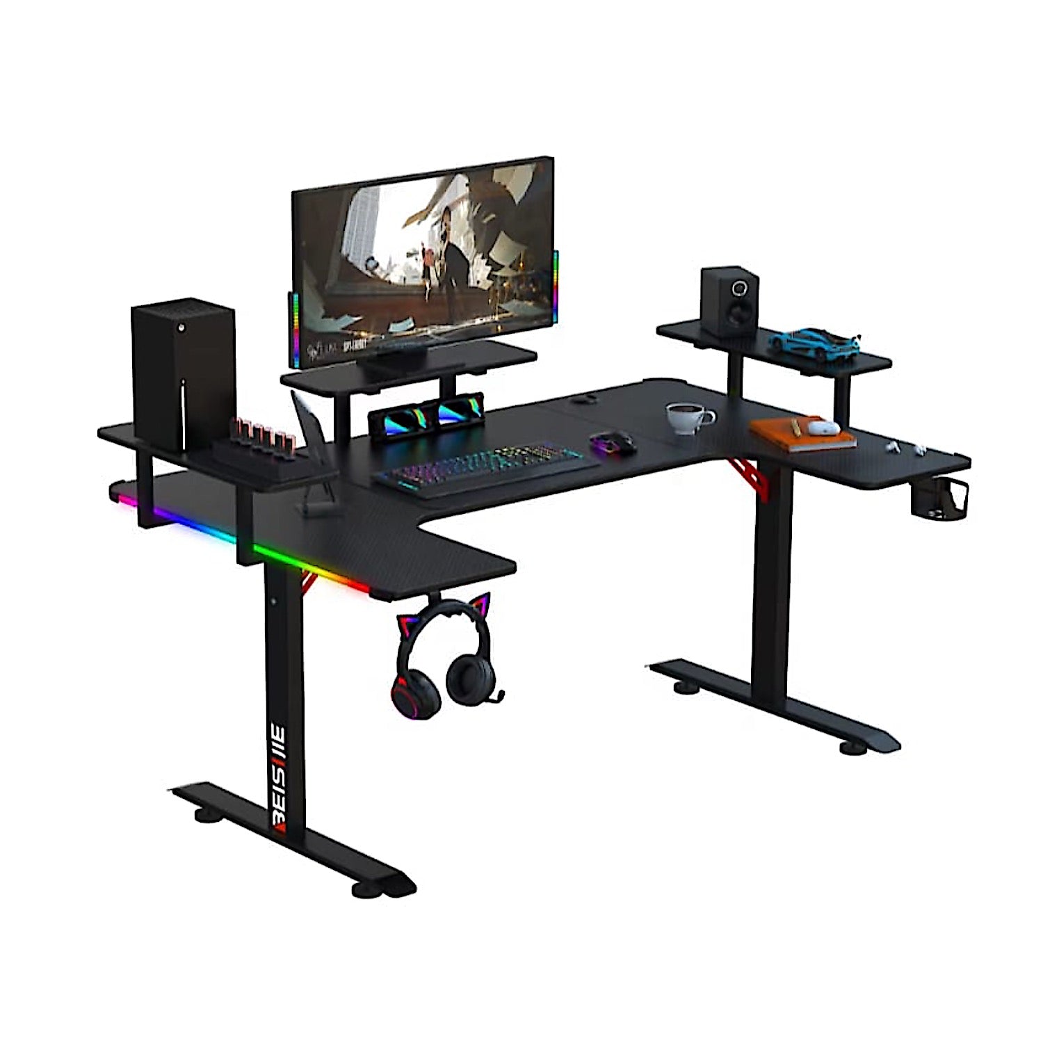 The U-shaped design provides extra room for multiple monitors, keyboards, and accessories while keeping everything within easy reach. Built-in cup holder and headset hook help keep your setup organized and clutter-free. A sturdy metal frame ensures durability and stability even during intense gaming sessions.