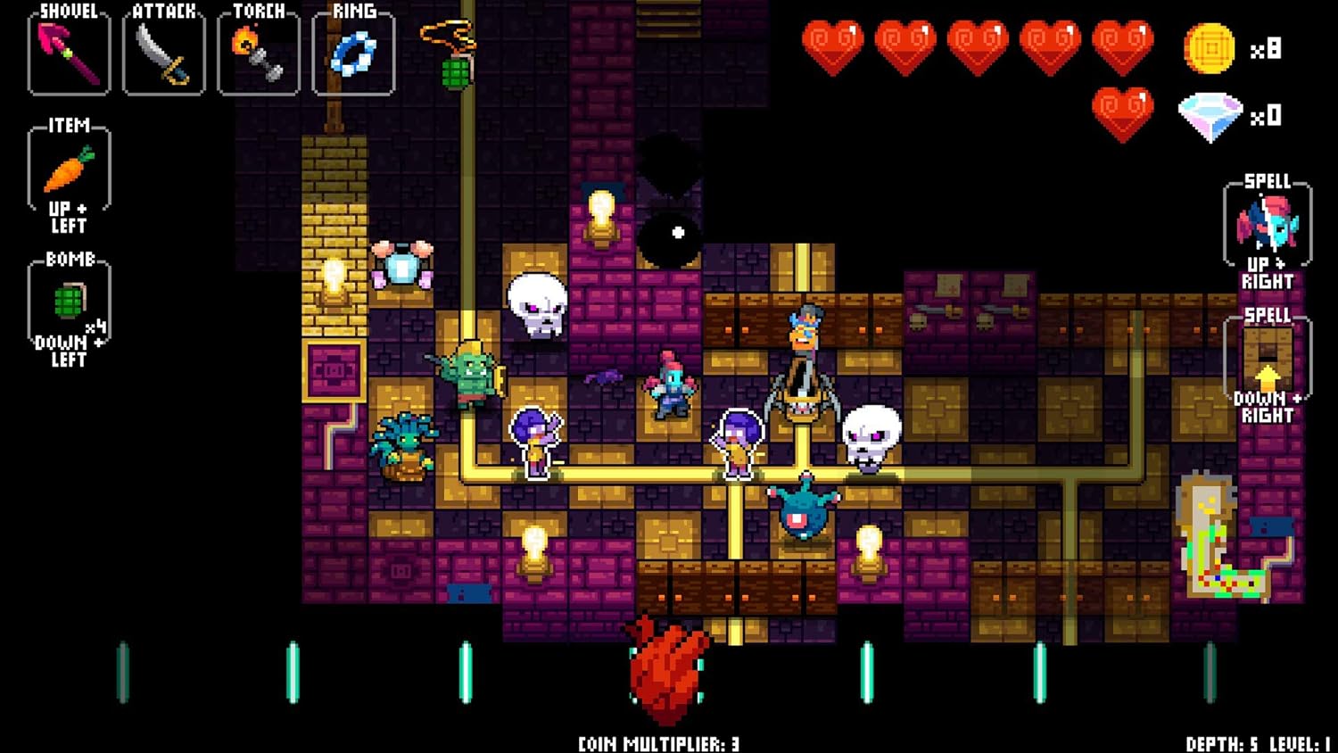 Crypt of the NecroDancer is an award winning hardcore rhythm-based dungeon crawling game. Can you survive this deadly dungeon of dance, slay the NecroDancer, and recapture your still beating heart? Or will you be a slave to the rhythm for all eternity? Join Cadence as you move to the beat through this rhythm-based roguelike adventure! Find your enemies'weaknesses and unlock new characters while plunging further into the depths of the Crypt of the NecroDancer to reclaim your still bearing heart - or be doomed to dance forever in this dungeon. Players must move on the beat to navigate randomly generated dungeons while battling dancing skeletons, zombies, dragons, and more, while grooving to the game's award winning Danny Baranowsky soundtrack! You can even team up with a friend in local co-op mode! Slay the NecroDancer! Delve into the dungeons in this hardcore rhythm-based roguelike.