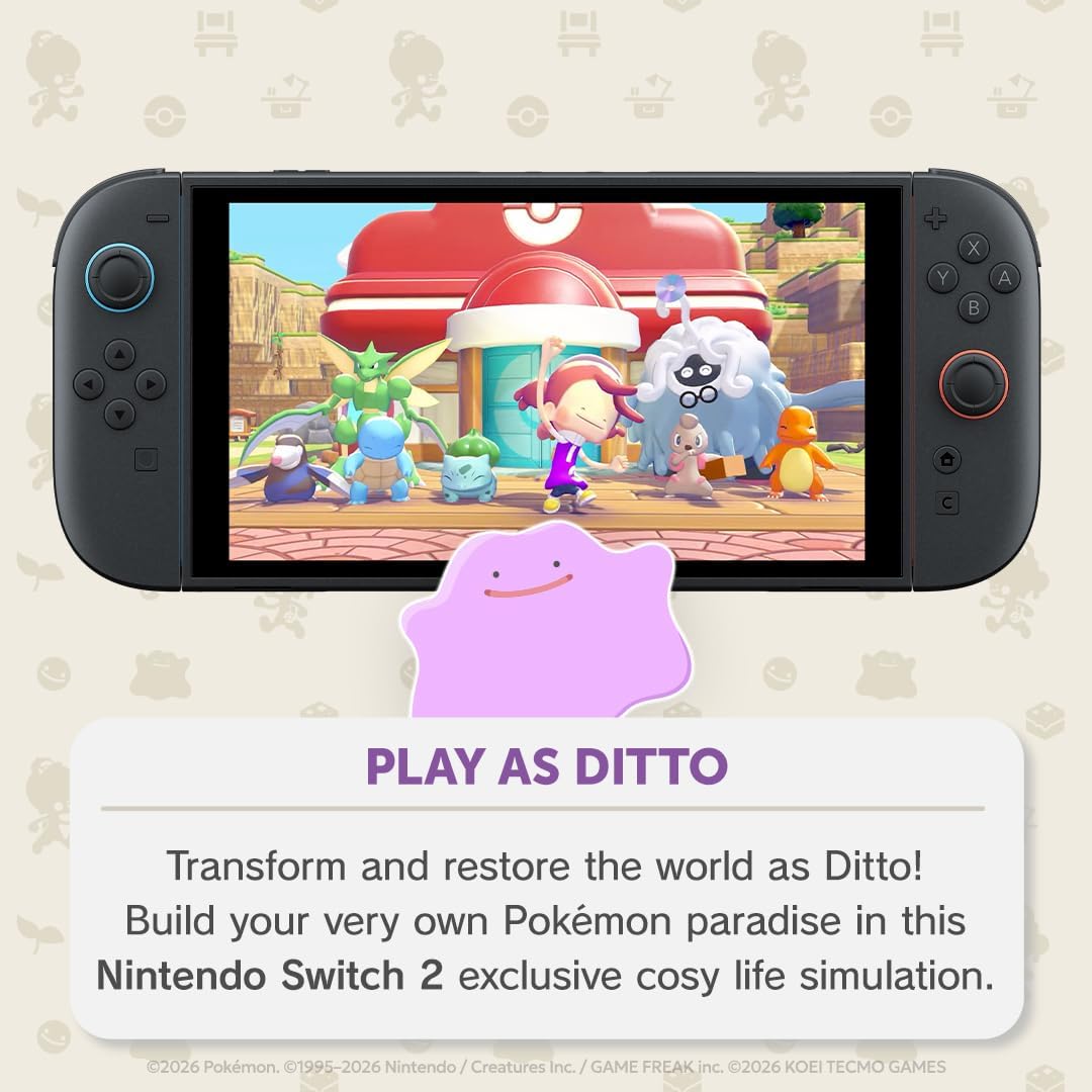 Shape the land and build a cosy new life with Pokémon Play as a Ditto that has taken the appearance of a human! Find and befriend your fellow Pokémon and carve out a life for yourself by learning their moves to shape the land. Use Bulbasaur’s Leafage to make wild grass grow, keep it healthy with Squirtle’s Water Gun, and more. As nature flourishes, more Pokémon will appear for you to meet and learn from! Build homes, farm crops, and more in a world with days, nights, and varied weather Collect rocks and wood to build with, till the fields to grow delicious crops, build homes for the Pokémon you meet...there’s so much to do here! No need to rush, though—go at your own pace and enjoy the journey. With a day and night cycle, varying weather, and other surprises, just taking a nap in your bed and letting time pass can be pretty relaxing. As you make progress, you’ll eventually be able to build a nice big home of your own—and then invite Pokémon and even other players* to visit and hang out with you! * Nintendo Switch Online membership (sold separately) and Nintendo Account required for online features. Internet access required for online features.
