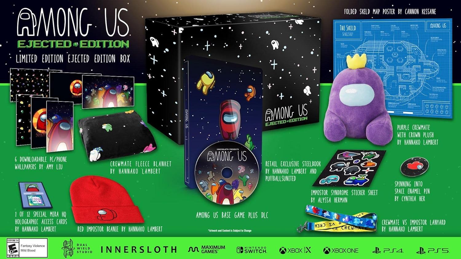 Join your crewmates in a multiplayer game of teamwork and betrayal! Play online with 4-15 players as you attempt to hold your spaceship together and return back to civilization. But beware... as there may be an alien impostor aboard! One crewmate has been replaced by a parasitic shapeshifter. Their goal is to eliminate the rest of the crew before the ship reaches home. The Impostor will sabotage the ship, sneak through vents, deceive, and frame others to remain anonymous and kill off the crew. While fixing up the ship, no one can talk to maintain anonymity. Once a body is reported, the surviving crew will openly debate who they think The Impostor is. The Impostor's goal is to pretend that they are a member of the crew. If The Impostor is not voted off, everyone goes back to maintaining the ship until another body is found. If The Impostor is voted off, the crew wins! Among Us: Ejected Edition Includes: Among Us base game and all of the DLC items: Airship, Polus and MIRA HQ Skins, and Hamster Pet, Bedcrab Pet, Brainslug Pet, Stickmin Pet, and Mini Crewmate bundles; Retail Exclusive "Innersloth Cosmicube” featuring cosmetics from prototypes we made that never became full-fledged games, this cube holds all the secrets of the Innersloth team; Limited Edition SteelBook by Hannako Lambert at Dual Wield Studio; Impostor Syndrome Sticker Sheet by Alyssa Herman; 1 of 12 Special Mira HQ Holographic Access Cards by Hannako Lambert at Dual Wield Studio; Folded Skeld Map Poster designed by Cannon Kissane; Redeemable Code for 6 PC/Phone Wallpapers by Amy Liu at Innersloth; Crewmate vs Impostor Lanyard by Hannako Lambert at Dual Wield Studio; Purple Crewmate Plush by Hannako Lambert at Dual Wield Studio; Spinning Into Space Enamel Spinner Pin by Cynthia Her; Crewmate Fleece Blanket by Hannako Lambert at Dual Wield Studio; Red Impostor Beanie by Hannako Lambert at Dual Wield Studio; and Limited Edition Ejected Edition Box. *Note: Subscription/Internet is required for online multiplayer.