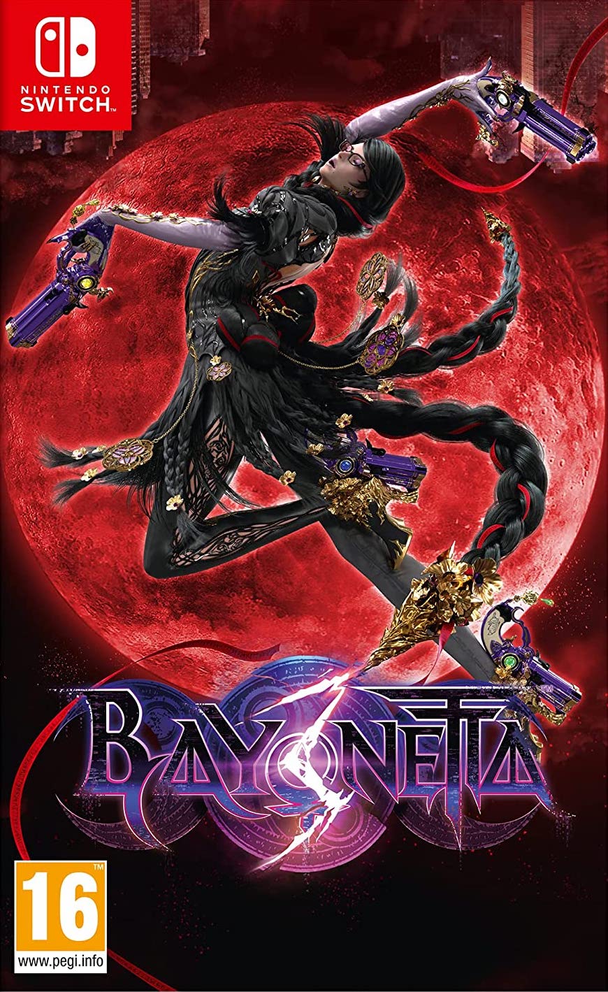Features: Bayonetta is locked in a pretty intense battle with a figure, covered in purple fire, who appears to defeat Bayonetta and disappear in a puff of smoke Third game in the action series: Bayonetta Unleash new combos, powers and summons Supports play modes: TV, tabletop, and handheld