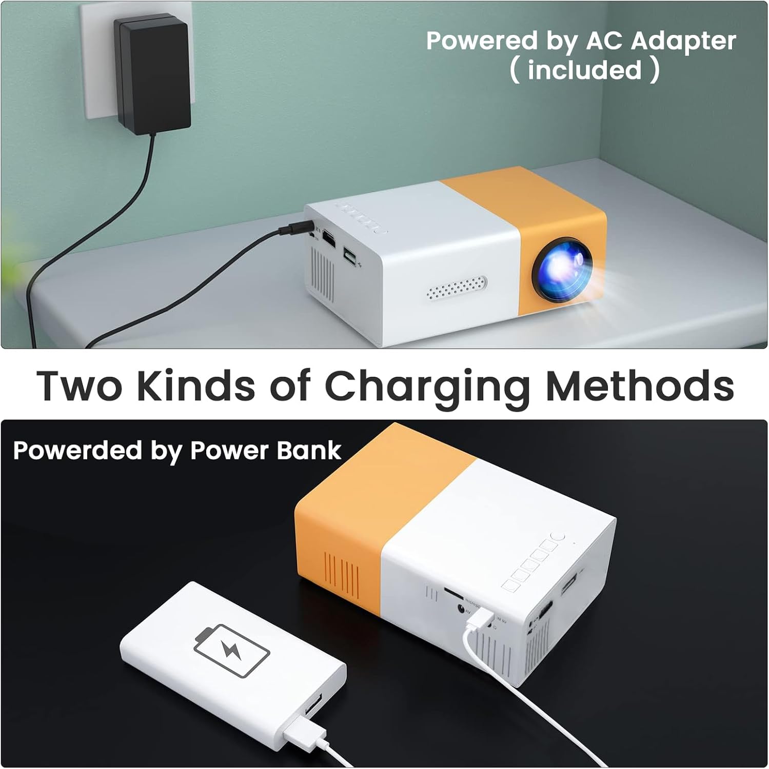- [USB Charging Port] The portable projector is USB powered by multiple devices, such as USB changer, mobile power and laptop. Very convenient to carry and no worry about power-off.